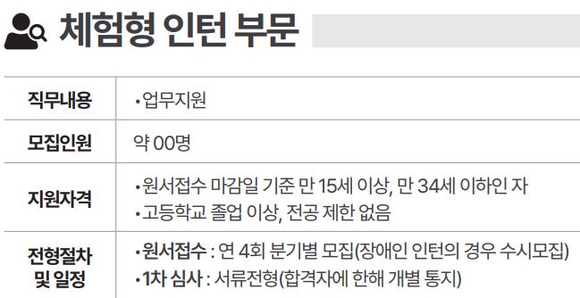 - 원서접수: 연 4회 분기별 모집(장애인 인턴의 경우 수시모집).