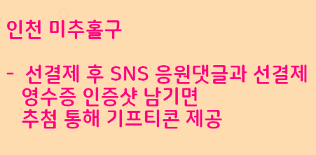 인천 미추홀구에서는 긴급재난 지원금을 선결제후 SNS 응원 댓글과 선결제 영수증 인증샷을 남기면 추첨을 통해서 기프트콘을 제공하는 캠페인을 한다고 합니다.