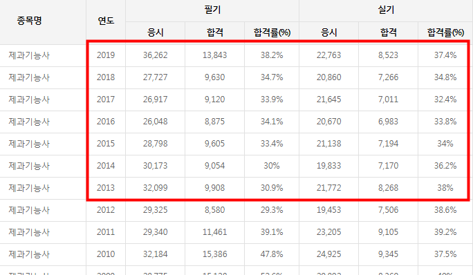 위에 연도별 합격률을 보시면 제가 기능사의 합격률 같은 경우에는 필기시험 같은 경우에는 30%가 나오고 실기시험은 오히려 필기 시험 보나 더 쉬운 줄 몰라도 30%가 확정되었습니다. 그러니 제과제빵기능사를 준비하시는 분들은 열심히 하시면 제과제빵기능사 필기 시험에 충분히 합격하실 수 있고 실기시험 동안 무난하게 합격하실 수 있습니다.