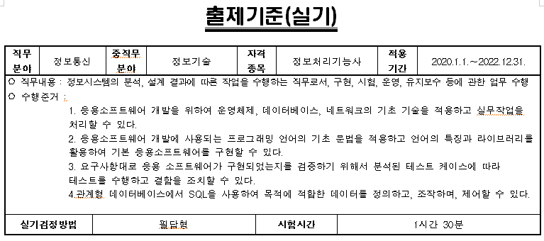 응용소프트웨어 개발 및 그에 대한 프로그래밍 언어 기초 문법 적용 관계형 데이터베이스 SQL 사용에서 정리하고 도착할 줄 알아야 합니다. 전기기능사의 경우에는 필기시험 보다 실기시험이 더 쉬운 경향을 보이고 있습니다.