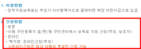어린이집 보육료 지원 신청 이용 방법은 부모가 아이행복 카드로 어린이집에 결제하면 해당 어린이집으로 입금되는 방법입니다.