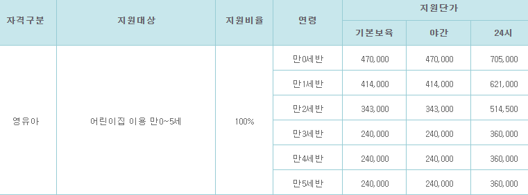 영유아 어린이집보육료 지원대상은 위에서 보시다시피 만영 3에서 5곳에 까지이며 연령별로 지원 단가가 다르니 위해서 참고하시기 바랍니다.