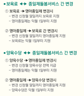 보육료와 종일제 돌봄서비스 가네 변경이 가능하다고 양육수당과 종일제 돌봄서비스 간도 변경이 가능합니다.