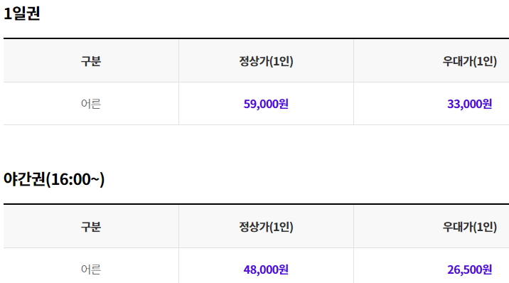 보시는것처럼 자유이용권 1일권이 성인인데도 33,000원이면 구입하실수 있으며