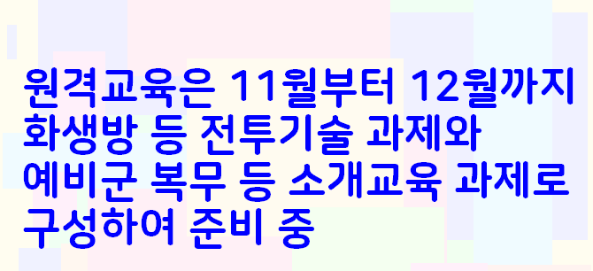 참여자율형 원격교육은 예비군 훈련을 4시간으로 단축해서 실시 예정이던 교육을 취소하고 11월부터 12월까지 참여자율혈 예비군 교육을 대체하여 실시할 예정이라고 합니다.