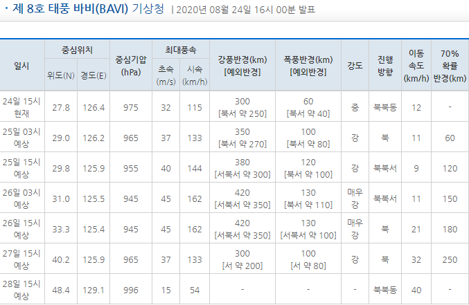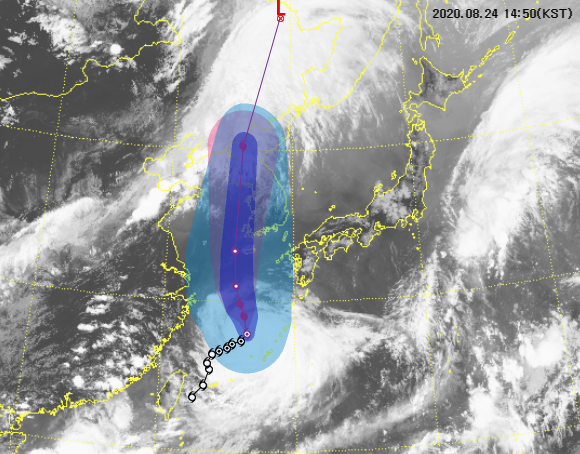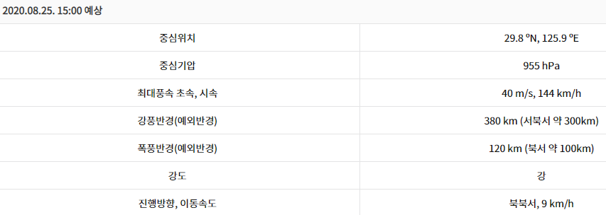위에서 보시다시피 8월 25일 15시에 제주도 서귀포시 남남서쪽 약 390km 부근에서 해상하기 시작하여 태풍이 시작될 것으로 보입니다.