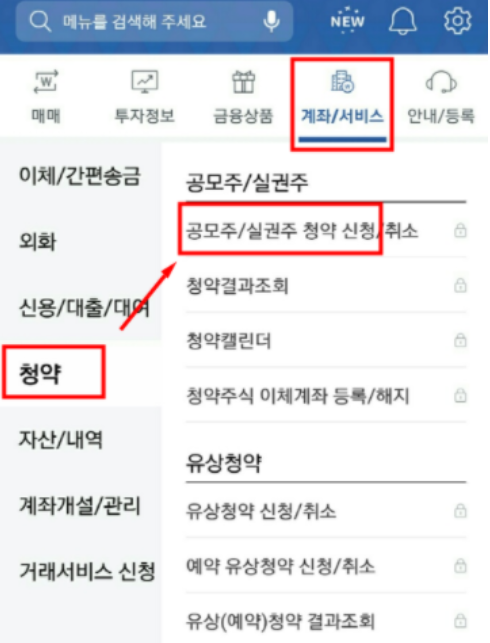 2. 계좌서비스를 클릭하고 청약 메뉴에서 공모주/실권주 청약 신청을 누릅니다.