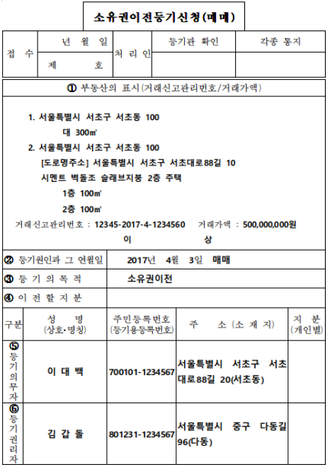 소유권이전등기 신청서 양식, 작성법(hwp 예시 파일)