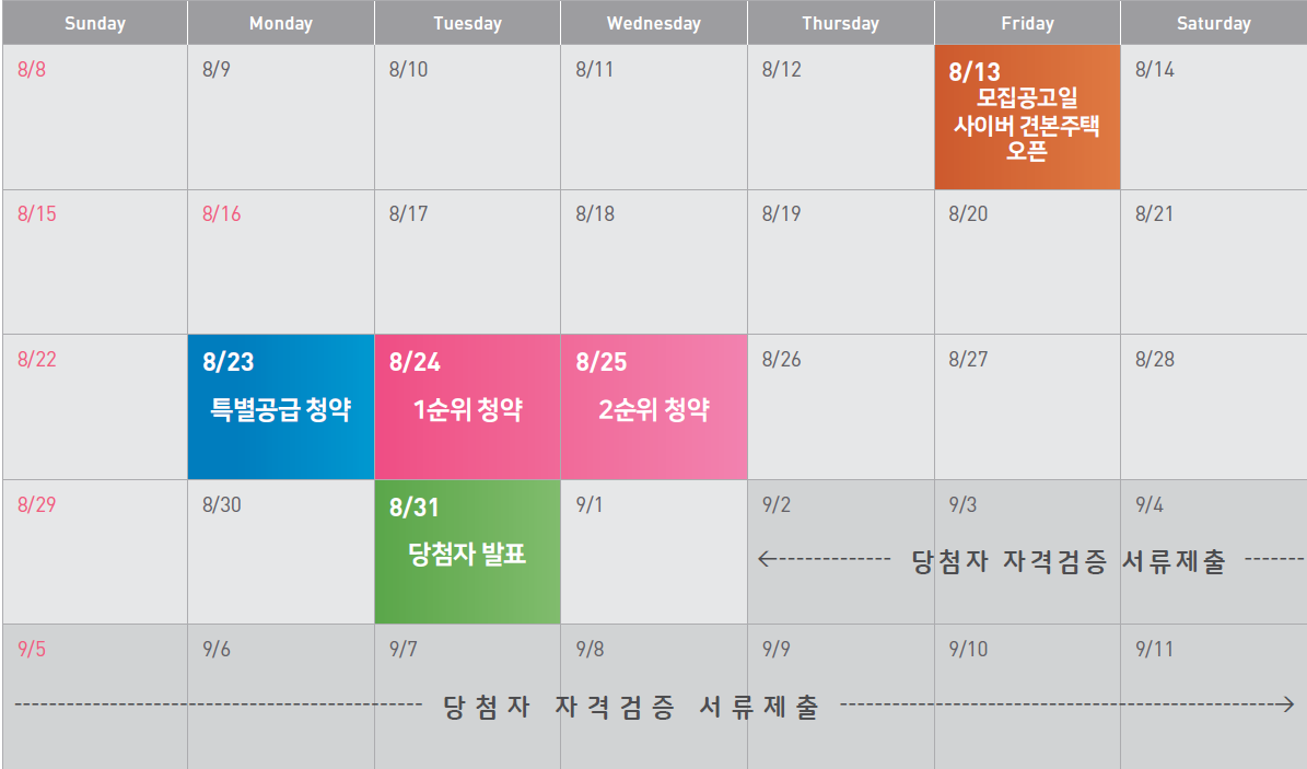 8월23일에 특별공급 청약이 시작되며 1순위 청약접수는 8월24일입니다.