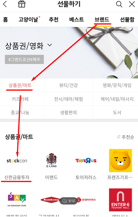 두번쨰. 상단에 브랜드 메뉴에서 '상품권/영화/도서'를 선택합니다.