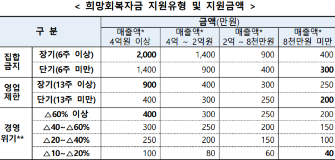 또한 매출액이 얼마나 큰 사업장이냐에 따라서 희망회복자금 지급액이 위 표처럼 다르게 지원받으실수있습니다.