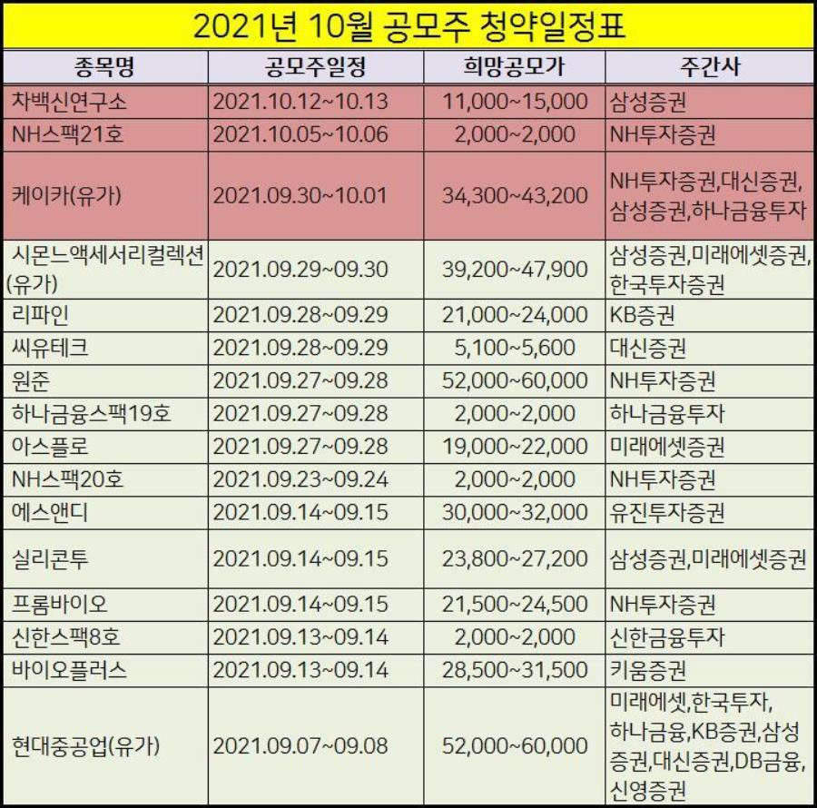 마지막으로 2021년 10월 공모주 청약일정을 알려드리겠습니다.