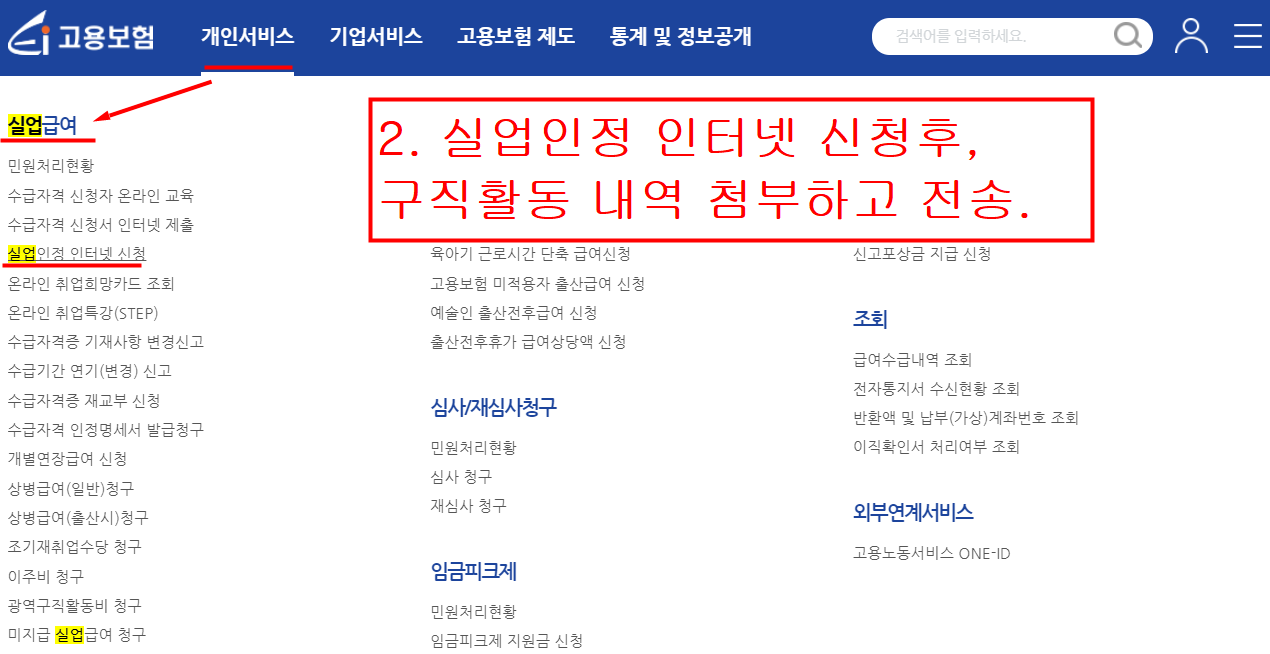 2. 실업인정 인터넷 신청이라는 메뉴에 들어가셔서 신청서를 작성하시면 됩니다.