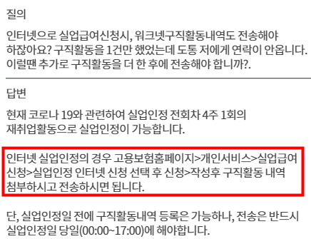 고용보험 홈페이지에서 간단하게 구직활동내역을 인터넷 전송하실수있으니 확인하시기 바랍니다.