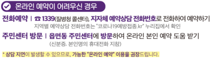 1. 전화예약방법 : 질병관리청 콜센터 1339 또는 지자체 예약상담 전화로 사전예약 가능합니다.