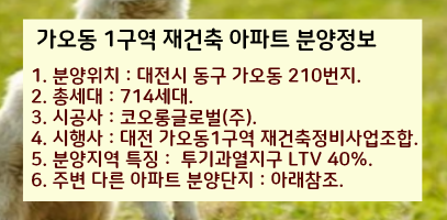 오늘은 이렇게 대전시 동구에 위치한 가오동 1구역 재건축 아파트 분양정보와 예정 계획을 살펴봤습니다.