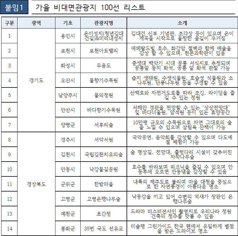 아래 한국관광공사 가을 비대면 관광지 100곳도 확인하세요.