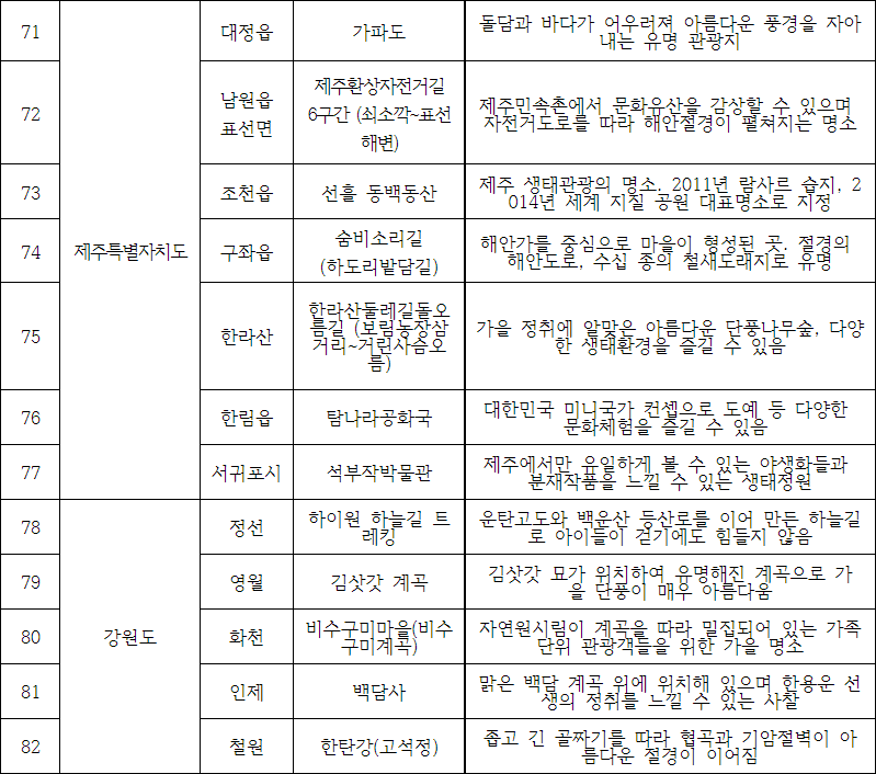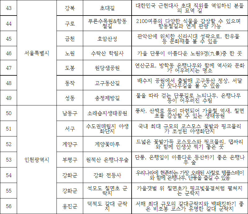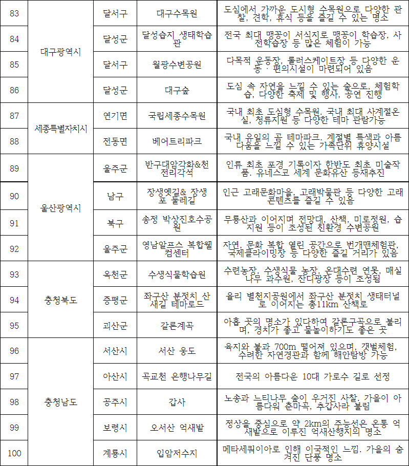 100곳중에서 가장 가까운곳이나 방문하고 싶었던 지역의 가을 여행하기 좋은곳들 몇곳 선정해서 가보시기바랍니다.