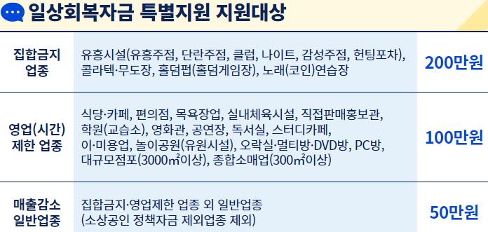 집합금지(200만원) 및 영업시간제한(100만원) 업종뿐만아니라 일반업종도 50만원 지급합니다.