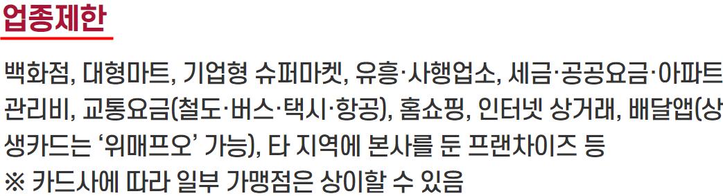 백화점이나 대형마트, 기업형마트, 유흥시설, 아파트 및 세금 공과금, 교통요금, 인터넷쇼핑은 사용이 제한되니 참고하시기 바랍니다.
