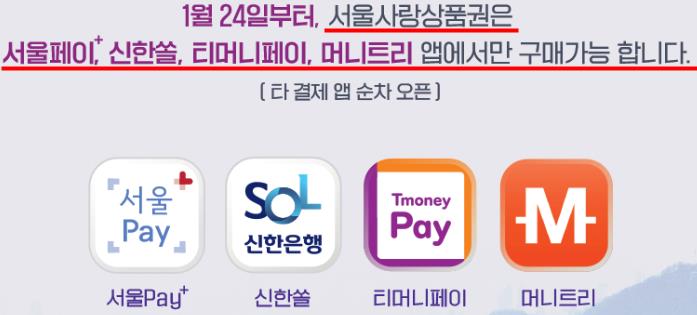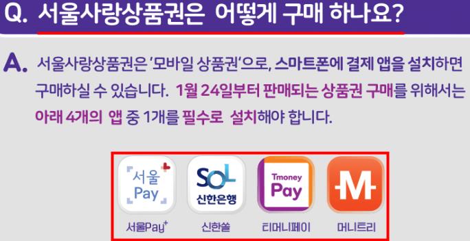 서울사랑상품권은 서울PAY, 신한쏠, 티머니페이, 머니트리 어플 중 1곳에서 구입하면됩니다.