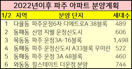 2022년 파주 분양예정 아파트들을 표로 정리했습니다.