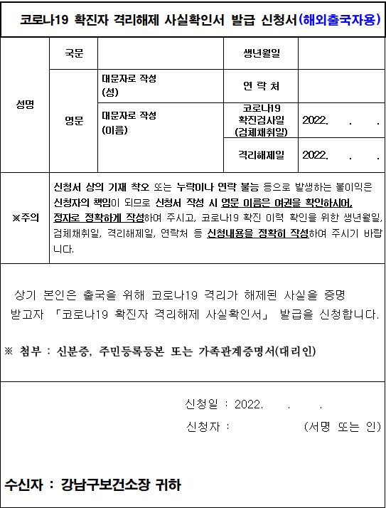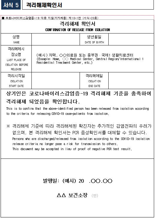 출국하실때 영문 격리해제 확인서 제출시 사용하시기 바랍니다.