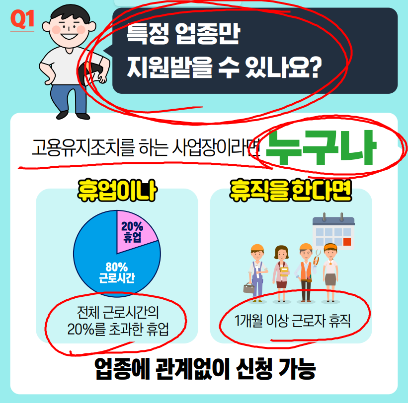 고용유지 지원금에 신청 대상에 대해서 많이 질문하시는 것 중에 하나는 특정 업종만 지원받을 수 있는지에 대해서 물어보십니다. 고용유지 조치를 하는 사업장이면 누구나 업종에 관계없이 신청이 가능하다고 합니다.