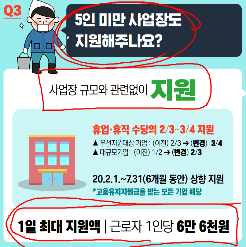 도한 고용유지 지원금 신청대상이 오이 미만의 사업자도 지원해주는 지에 대해서 사업자 규모에 관계없이 지원을 해 준다고 합니다.