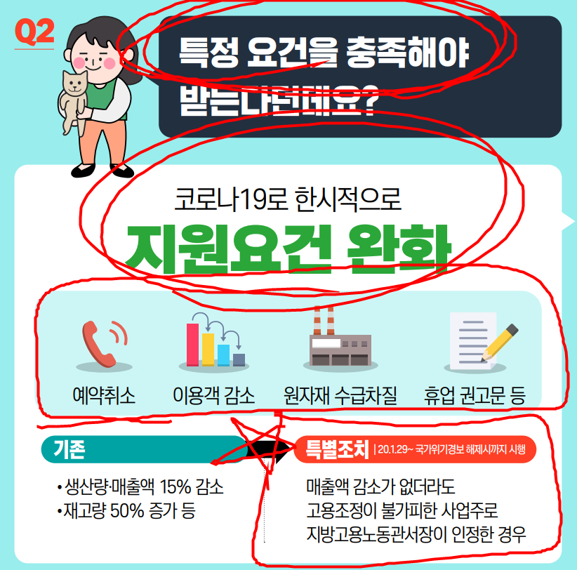 기존에는 생산량과 매출액이 15% 감소하거나 재고량이 50% 증가 하는 등의 조건이 있었다면 이번 코르나로 인해서 고용유지지원금 특별 조치는 매출액 감소가 없더라도 고용조정이 불가피한 사업체로 지방고용노동관서장의 인정한 경우에 고용유지지원금 신청이 가능하다고 나와 있습니다.