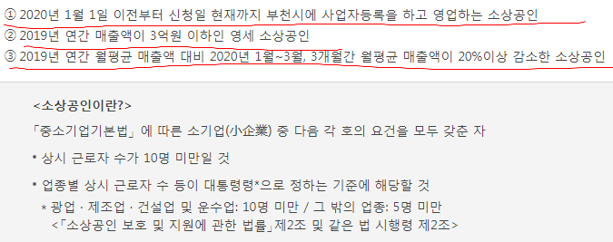 경기도 부천시 소상공인 재난 지원금을 신청하기 위해서는 우선 기본적으로 2020.1.1. 이전에 경기도 부천시에 사업자 등록해야합니다. 또한 서울시 자영업자 생존자금보다도 더 지원범위가 넓은 매출 3억원 이하의 소상공인이면 재난 지원금 50만원 신청이 가능합니다.