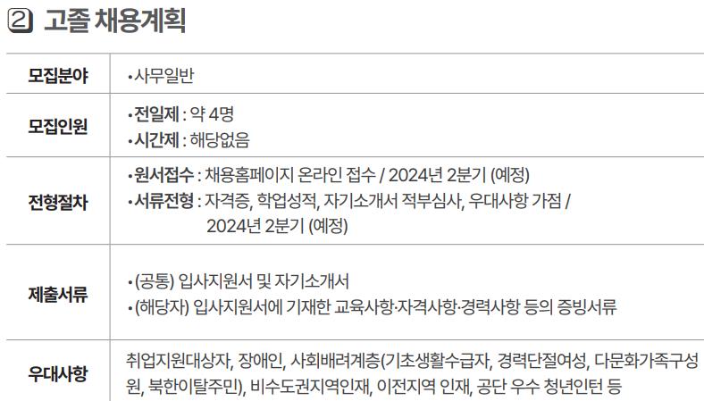 세부계획은 2024년 2분기에 확정 예정이며, 우대사항은 취업지원대상자, 장애인, 사회배려계층 등이 포함됩니다.