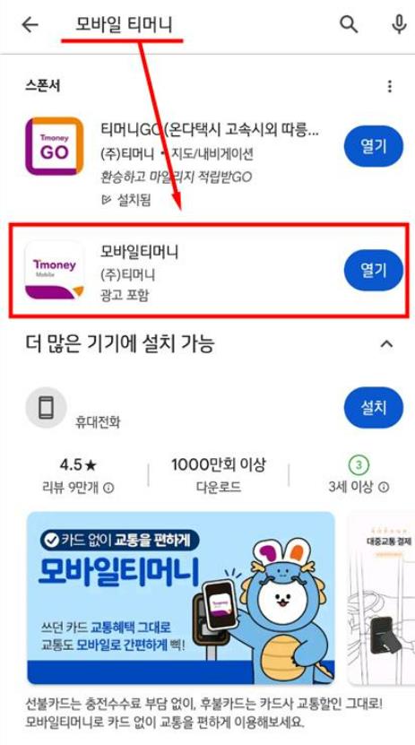 첫번째. 구글 스토어에서 '모바일 티머니'를 검색합니다.