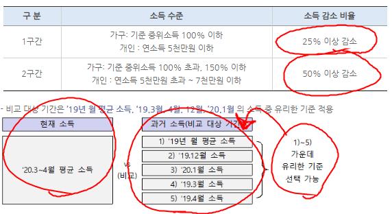 '20년 3월~4월 평균소득이 코로나 이전 비교 대상 기간과 비교하여 소득이 감소하여야합니다.