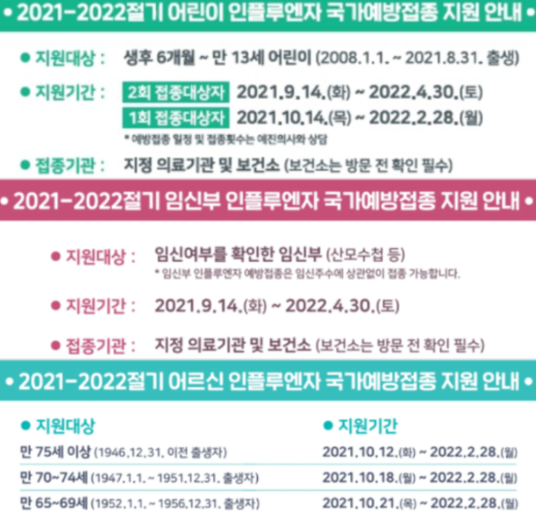 2021-2022절기 인플루엔자 국가예방접종 무료 대상자는 어린이와 어르신, 임신부입니다.