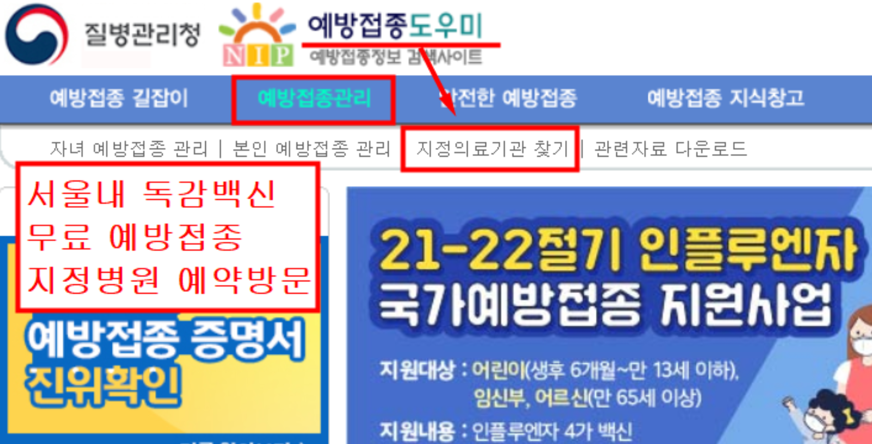 질병관리청 예방접종도우미 홈페이지(nip.kdca.go.kr)에서 무료 독감백신 지정병원을 조회하세요.
