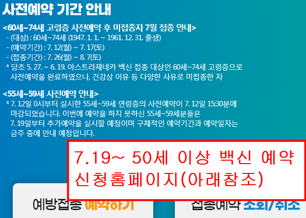 50세 이상도 백신 예약이 7월19일부터 코로나 백신 예약이 가능합니다.
