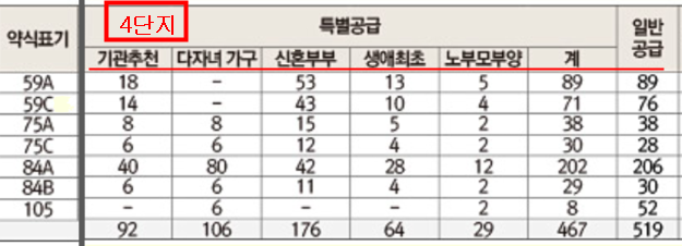 두번째. 특별공급 세대수 : 기관추천(92세대수), 다자녀가구(106세대수), 신혼부부(176세대수), 노부모부양(29세대수)로 총 467세대수를 특별공급으로 분양합니다.