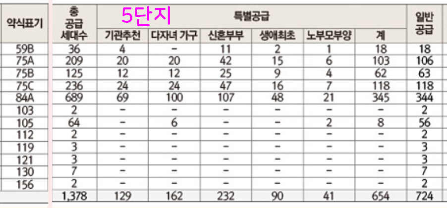 5단지 특별공급중에서 가장 많은 청약 전형은 신혼붑주특별공급 232세대수, 다자녀가구특별공급 162세대수, 기관추천은 129세대수를 지원하며, 생애최초 특별공급은 90세대수를 분양합니다.