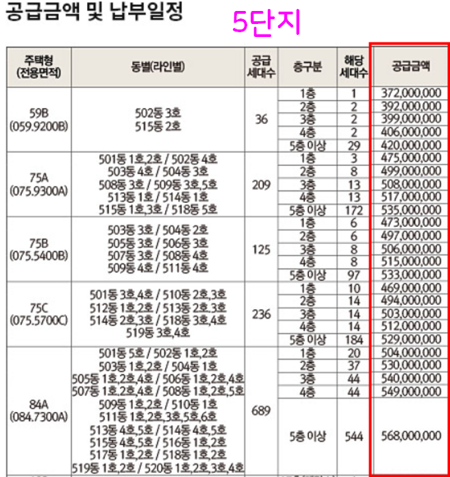 3. 84A형 분양가 : 아래표에서 보듯이 5억원 초반에서 후반까지로 나왔습니다.
