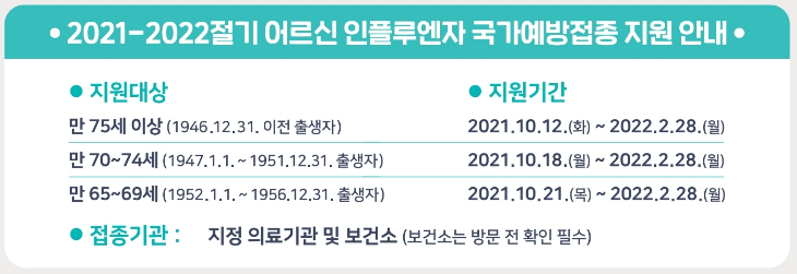 3. 만65세~69세까지는 2021년 10월21일부터 2022년 2월 28일까지 국가 예방접종 지원기간입니다.