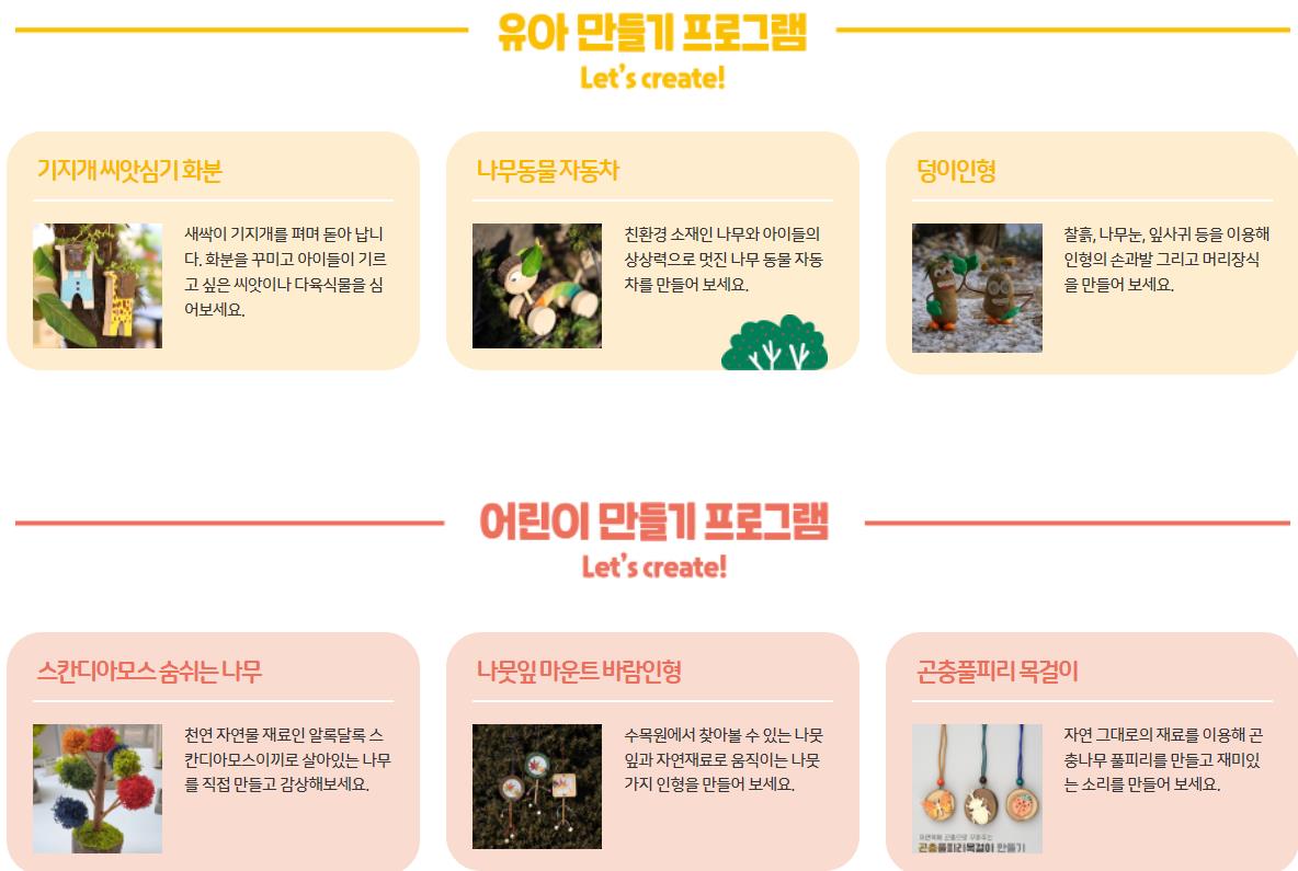 1. 유아 대상 : 기지개 씨앗심기화분, 나무동물 자동차, 덩이인형 만들기.