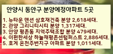 또한 위에서 안양시내 동안구에서 분양예정인 아파트 5곳도 알려드렸습니다.
