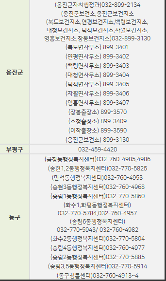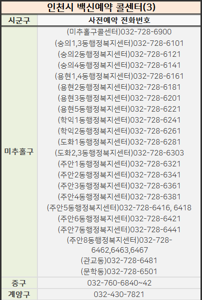 인천시의 경우에는 각 주민센터에서 백신 예약콜센터를 운영하고 있습니다.