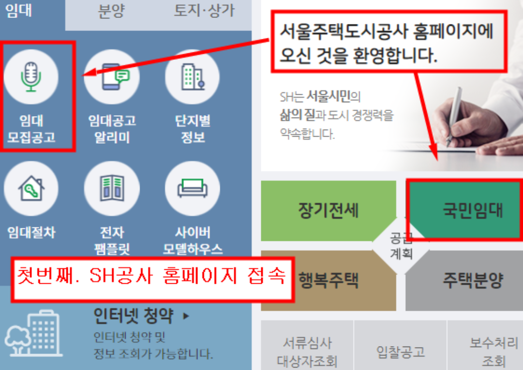 첫번째. SH공사(i-sh.co.kr)에 들어가시면 '임대 모집공고'게시판 메뉴가 있습니다.