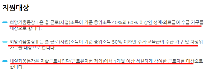 공통적으로 청년희망키움통장 등의 청년통장 신청 하기 위해서는 일을 하고 있는 저소득층으로서 기준중위소득 50% 이하이어야 합니다.
