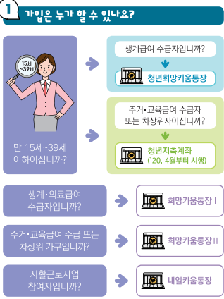 생계 급여 수급자의 경우에는 청년희망키움통장 신청하실 수 있고 육아 교육 급여 수급자 있는 경우 또는 천상의 경우에는 청년저축계좌를 신청하실 수 있습니다.