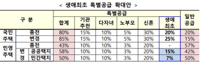 생애최초 특별공급의 경우, 점점 확대되고 있습니다. 따라서 85제곱미터 이상의 넓은 평수의 아파트 분양시에는 청약 가점이 낮아도 추첨을 통해서 당첨되실수있습니다.