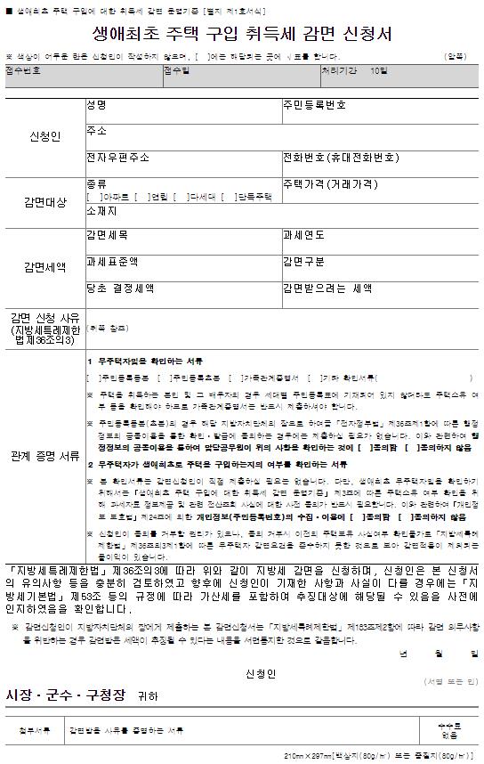 아래 생애최초 주택구입 취득세 감면 신청서 양식을 남겨놨습니다.