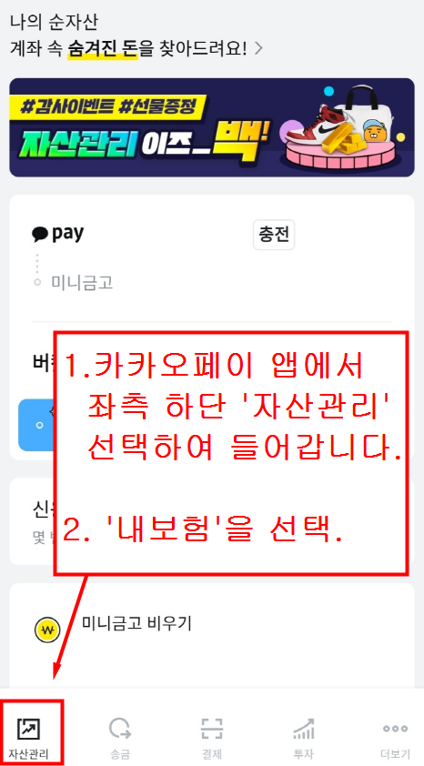 첫번쨰. 우선 카카오페이 앱에서 들어가시면 하단 좌측에 '자산관리'가 보입니다.